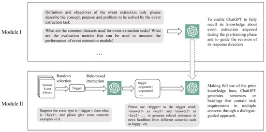 - Recall module: A continuous dialogue is established to allow ChatGPT to recall the event extraction knowledge it acquired during training. During this phase, questions related to event extraction and requests for data generation are posed to ChatGPT while continuously guiding and correcting its answers. Through extensive training on a large amount of textual data, ChatGPT learns the inherent logic of language and improves its generative ability by predicting the next word or sentence, accumulating a significant amount of semantic knowledge. In the first phase, an “activation question library” related to event extraction is created after multiple attempts. By continuously asking ChatGPT questions from the “activation question library”, the model is guided to recall the knowledge it acquired during training regarding event extraction. The “activation question library” includes the basic definition of event extraction tasks, particularly the meaning of trigger words and event arguments, the construction of commonly used datasets for event extraction, and relevant examples. Correct answers are encouraged and supported, while incorrect answers are corrected and guided, thus activating ChatGPT’s relevant knowledge on event extraction and establishing sufficient contextual connections.
