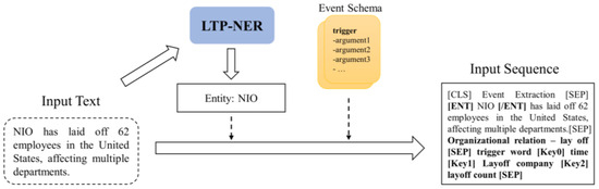 Figure 3. Generative input template construction diagram. - The event schema is introduced as event information and added to the input sequence. Specifically, at the beginning of the text, “Event Extraction” is added as a task prompt to indicate the current task mode to the model. Then, the event schema, including the trigger words and event arguments, is enumerated and concatenated to the end of the text, constraining the generated label content.