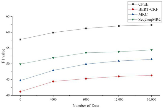 The specific values are shown in Table 6. With the increasing corpus size from 0 to 16,000, the F1 value of the model CPEE improves from 57.7% to 62.3%, which is a 4.6% improvement; the BERT-CRF improves from 41.2% to 46.1%, which is a 4.9% improvement, the MRC improves from 44.7% to 51.4%, which is a 6.7% improvement, and the Seq2seqMRC improved from 49.9% to 54.4%, an improvement of 4.5%, indicating that larger-scale training data play a positive role in improving model performance. However, the rate of improvement in F1 values of individual models on the event extraction task decreases as the data size continues to increase. For example, the model CPEE improves the F1 value by 3.5% at data sizes from 0 to 8000, yet only by 1.1% at data sizes from 8000 to 16,000. It is hypothesized that the initial annotated corpus enables the model to capture the basic patterns and rules of ChatGPT-generated data, which results in rapid performance improvement. However, as the size of the labeled corpus increases further, the new data samples have less information uniqueness compared to the existing data, leading to a gradual slowdown in the model’s performance improvement for the new samples.