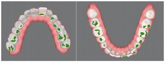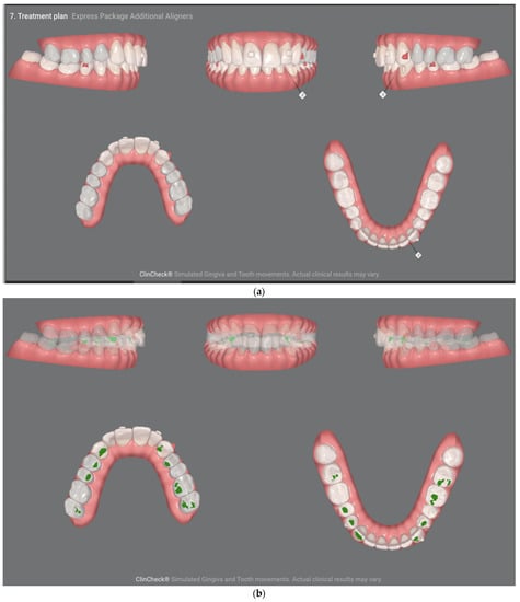 The patient wore the aligners 22 h a day, changing each aligner every 10 days. In the case of patients with a reduced periodontal bone level, tooth movements in the aligners should be halved, i.e., each aligner affects the teeth half as much as during orthodontic treatment in the case of a healthy periodontium.