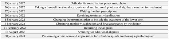 The porcelain crown on tooth 21 was not modelled correctly, which resulted in chronic traumatic occlusion and atrophy of the vestibular lamella of the maxillary alveolar process in the vicinity of this tooth. Based on the history and clinical examination, no other causes were identified that could contribute to the loss of bone tissue in the area of tooth 21. The influence of such local factors as leakage or recontouring of the prosthetic crown in the area of the tooth neck, root caries, the presence of bacterial plaque and inflammation of the gums or periodontium, as well as general factors such as smoking, general diseases, morphology results and vitamin D concentration were taken into account. These parameters were regularly monitored in the patient due to the history of cancer and chemo- and radiotherapy. For this reason, it was decided to reduce the X-ray dose as much as possible and CBCT was abandoned, and the diagnosis was made on the basis of intraoral examination, scan and pantomogram analysis. The schedule of visits is presented in Figure 3.