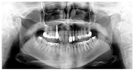 Figure 5. Pantomogram—visible porcelain restorations and an implant in area 14.