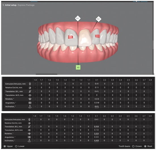 - Figure 8. (a) Movements of tooth crowns in the upper arch. Visible leading moves, 1.3—distortion, 1.1—distortion and buccal inclination, 2.1 distortion. (b) Movements of tooth roots in the upper arch. Leading movements tooth no. 1.3 distorotation, 1.2 distorotation, 1.1 distorotation and lingual inclination, 2.1 buccal inclination (c).