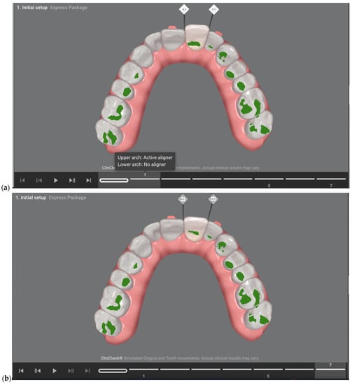 After using seven aligners, the patient was scanned again to continue treatment with the use of another seven aligners in order to achieve the best possible treatment results. The occlusion after the first part of the treatment (after the first seven aligners) is shown in Figure 9a,b. No occlusal overloads on the upper incisors are visible; thus, therapeutic success was achieved.
