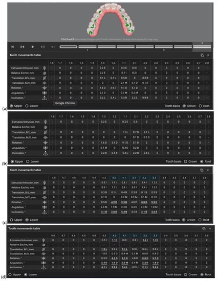ClinCheck of the second treatment plan. (a) presents the movements of the crowns in the upper arch, (b) presents the movements of the roots in the upper arch (c) presents the movements of the crowns in the lower arch (d) presents the movements of the roots in the lower arch. The numbers in the tables are expressed in milimeters (mm) and degrees (°). I—intrusion, L—lingual, D—distal, M—mesial. The underlined numbers are to most extensive movements of the tooth—of all the presented movements.