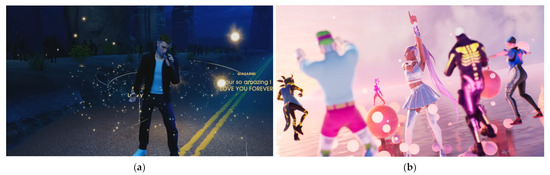 As global pandemics limit outdoor activities, various arts and cultural services and systems are attempting to operate non-face-to-face. In particular, metaverse platforms, which offer immersive environments to overcome the lack of physical presence, a limitation of online contexts, are garnering significant attention. To provide immersive experiences, 3D metaverse games including Roblox and Minecraft are utilized [1,2,3,4]. Recently, with the development of various metaverse games and platforms, many planners and researchers are actively conducting studies and making efforts to implement the metaverse. Likewise, in the concert industry, musicians are starting to host virtual concert events using various metaverse platforms. This trend of major artists participating in virtual concert services is accelerating [5,6,7]. For instance, startups providing virtual concert platforms, such as WAVE, where avatars perform live concerts, have attracted investments of up to 30 million dollars. These industries are expanding their content by producing concerts with world-class artists such as Justin Bieber and Ariana Grande, as shown in Figure 1, against the background of enormous capital.