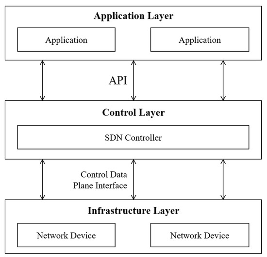 Software-defined networking (SDN) is a concept of defining and controlling networks through software, a framework designed and built to manage traffic handling methods and various functions in a centrally controlled system by separating the data and control domains. This concept was devised to overcome the complexity and flexibility limits of traditional hardware-centric network structures and to implement user-centric networks. It started with a paper published in August 2007 by Stanford University, proposing a way to facilitate network management and enhance security [11]. SDN provides an open interface that enables the development of software capable of controlling connectivity provided by a set of network resources and network traffic flow, along with potential inspection and modification of traffic performed in the network. As illustrated in Figure 2 below, SDN is composed of three layers, emphasizing four features: the central separation of the Infrastructure Layer and Control Layer, a central controller, an open interface between the Control Layer devices and Infrastructure Layer devices, and network programming by external applications [12].