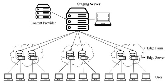 The content delivery network (CDN) was proposed to enhance the traditional content delivery method, which relied on a single large-scale server and could not guarantee quality while providing content to all users via the internet [14,15,16]. CDN provides multiple servers responsible for numerous users to prevent them from receiving content through unreliable internet bandwidth. Figure 3 below illustrates the servers constituting a CDN. Among the components of a CDN, the Staging Server receives content from the Content Provider and stores content to be distributed to other servers. All content distribution begins at the Staging Server and eventually arrives at the Edge Server, which is the server that delivers content to users and serves as the target for content distribution.
