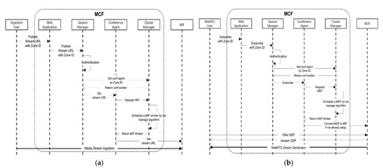 Figure 5 illustrates the sequence diagrams of microservices typically required when constructing an XDN. These examples represent operations performed in a zone network architecture within a WebXR-based system that supports XDN. Figure 5a represents the Media Ingestion Signaling Flow, illustrating the process of individual users ingesting from the MIF, while Figure 5b represents the Media Distribution Signaling Flow, showing the process of distributing streaming data based on WebRTC from the MDF to each user. Here, WebXR is a framework providing XR experiences based on WebRTC. As shown in Figure 4 and Figure 5, one can adopt microservices of XDN for ingesting or distributing media streaming data and, furthermore, it can be a good choice for transmitting immersive content.