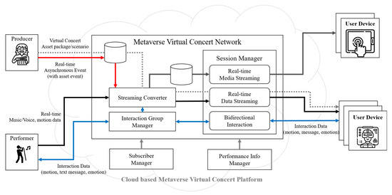 Before designing a network for the communication of interaction data, the network for the overall virtual concert must first be designed. The metaverse virtual concert platform allows subscribers to access the platform and participate in their desired virtual concert service channel according to role distinction, managed through subscriber management and concert information management. To provide scalable server operations and variable load balancing features, the virtual concert platform is loaded onto a cloud-based server. This allows for an increase in the number of physical subscriber servers as the number of simultaneous users increases. As shown in Figure 6, pre-defined fixed stage-related assets in the planning process for the virtual concert hall and stage equipment are downloaded before the real-time concert, and during the real-time concert, only real-time data provided from the performers are streamed.