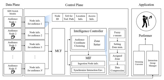 Considering the virtual channel and the dynamically changing network environment, we adopted an SDN (software-defined networking) type of framework. The Data Plane is composed of node models that receive information from the audience in the virtual concert and perform SDN switch functions. The node and the process models inside the node send their information to the Control Plane, which is then delivered to the MCF (Media Control Function) microservice of the XDN for the preparation of authenticating audience information and assigning zones. Some studies receive and store the node’s information in the form of a pointer using a shared memory interface [33], but this study does not deal with specific packet processing methods for synchronizing other network depths outside of the interaction channel. The main information of the node received from the Control Plane includes the node’s Id, ToS for traffic path information, location in the virtual concert, and access environment information. Before the virtual concert begins, if the entire audience has entered, the MCF sends the node information to the Intelligence Controller.