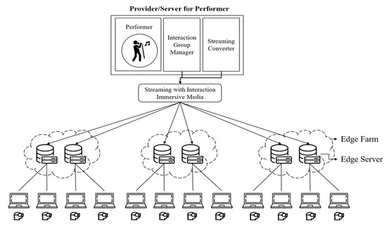 The interaction data from the node are sent to the performer and, to avoid affecting the performance provided in the form of streaming, the interaction transmission channel is kept separate. Furthermore, to synchronize the streaming and interaction, the MIF performs the task of synchronizing both channels. If the performer sends an interaction to the audiences, they bypass the separate MIF or Intelligence Controller and directly transmit interaction data to all nodes. As shown in Figure 8, not only does the performer provide performances through the streaming converter as a central server in the form of a CDN, but it also sends interaction data to each Edge Farm, supporting low-latency communication. Performers can configure the following CDN-based edge servers to transmit interaction data to large audiences. Edge servers are critical components in the proposed network structure to reduce latency and to manage traffic efficiently. They are strategically placed closer to the nodes (audience) and the performer, which allows data to travel shorter distances, resulting in faster data delivery. Here is a brief conceptual overview: