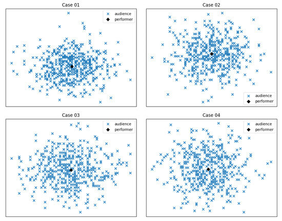 To recreate the environment where the audience is concentrated around the performer’s coordinates in a real performance, we used a hypergeometric distribution to generate random audience placement. The number of success states and the number of failure states were adjusted to be equal to each other to create a distribution of coordinates clustered around a central coordinate, which was set to be the performer’s coordinate. For this simulation, we set up a total of four random audience placements for a certain number of audience members, as shown in Figure 9.