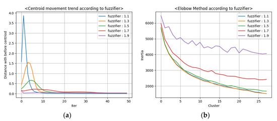 (a) Result of the centroid movement trend according to fuzzifier and (b) result of the inertia trend according to fuzzifier.
