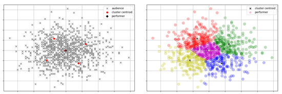 The clustering time has a linear relationship with the audience size, with a minimum value at audiences of 1000 and a maximum value at audiences of 10,000. The fuzzifier was set from 1.1 to 1.5 based on the previous experimental results, and the number of clusters was set from 4 to 10, which is the point where the inertia decreases rapidly in Figure 10b. The detailed experimental results are described in Table 3, and an example clustering result can be seen in Figure 11. The experimental results show a linear relationship between crowding and execution time, and the correlation between the execution time and fuzzifier is small. Considering the average network latency of 10–20 ms in Korea, we calculated the maximum latency of 50 ms per zone and, based on audiences of 10,000, we can assume that it takes from 267 ms to 549 ms for audience information to be transmitted and for audience and zone information to be received by the performer in the proposed framework.
