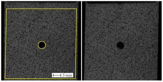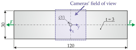 The analyses described in the paper were carried out on a specimen with a hole (Figure 1), made by water jet machining of PS-1 sheet (Vishay Measurements Group GmbH, Heilbronn, Germany) with 3 mm thickness, the material of which has a modulus of elasticity E = 2500 MPa and Poisson’s ratio μ = 0.38.