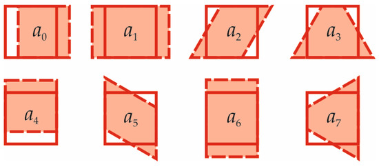 where are transformed coordinates, are lens-distorted 2D coordinates of the point in the normalized image plane and parameters represent possible displacement, elongation, shear, and distortion of the facet according to Figure 2.