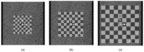 The calibration of the cameras of the Q-400 Dantec Dynamics correlation system was realised by three different calibration targets with 9 × 9 checkerboard fields. In the first case, each array had an edge length of 1.5 mm (Figure 5a). In this case, the area of the target in the calibration mode, which is performed at the full resolution of the cameras (2452 × 2056 px), covered approximately 12.5% of the field of view. In addition, the authors also performed calibration of the camera system using targets with edge lengths of 2.0 mm (Figure 5b) and 3.0 mm (Figure 5c). The middle of the targets covered approximately 22% of the field of view. The largest covered approximately 50% and almost perfectly copied the evaluated part of the sample. It should be mentioned that the targets with field sizes of 1.5 mm and 3.0 mm were supplied by the manufacturer. They are made by etching in ceramic material with very high precision, guaranteeing a nominal X/Y Standard Deviation of up to 1 μm [45]. In contrast, a 2.0 mm field size target was prepared by authors, printing on a vinyl film applied to a glass plate with an expected standard precision (nominal X/Y standard deviation of up to 150 μm) to analyse the measurement inaccuracies arising in such a case.