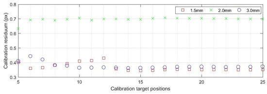 Since the standard calibration process runs relatively quickly (takes about 5 min), the user who changes the positions of the calibration target in the field of view of the cameras cannot continuously check the obtained calibration parameters and can only follow the recommendation of the manufacturer of the correlation devices Dantec Dynamics to monitor the value of the calibration residuum. For that reason, this parameter was also registered with each saved calibration file. Figure 7 shows the changes in the calibration residua determined by Istra4D during the three calibration processes. The residuum is the lowest (ca. 0.35–0.45 px) and approximately the same for both calibration targets supplied by Dantec Dynamics (1.5 mm and 3.0 mm) for the entire calibration process. In the case of the 3.0 mm target, a constant trend can be observed from the 10th recorded target position. The calibration residuum is significantly higher in the case of the target manufactured with less precision (2.0 mm). Its value (ca. 0.7 px) exceeds the level of 0.2–0.5 px, which Dantec Dynamics set as the level characterising a correctly performed calibration.