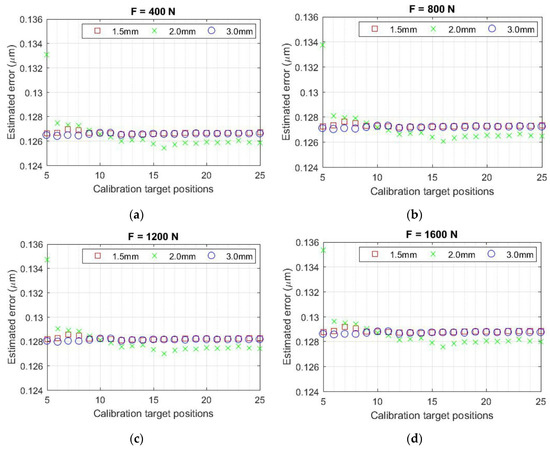 Plots of the estimated contour statistical error radius: (a) F = 400 N, (b) F = 800 N, (c) F = 1200 N, (d) F = 1600 N.