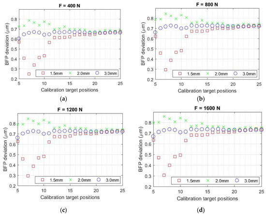 Based on the analysis of the plots of the deviation of the specimen surface from the best-fit plane (Figure 10), it can be concluded that the plots are also of the same character for each loading level and differ only minimally in values. In the case of using the largest target (3.0 mm), it is possible to observe an approximately constant level for any number of registered positions of the calibration target. Moreover, for this target, the lowest variance of BFP deviation values is observed, and from about the 12th registered position of the target, the values obtained show only slight differences. On the contrary, the most significant variance in values is achieved for a target size of 1.5 mm, which occurs for the number of registered positions of the calibration target less than 12. When using the target with the lowest manufacturing precision (2.0 mm), the variance of the values is not so significant. From its 12th registered position, the BFP deviation reaches a similar level as the other targets.