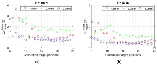 The plots of the mean relative differences in the evaluated equivalent von Mises stresses can be seen in Figure 11. Suppose we disregard the results obtained in calibration with the number of registered calibration target positions less than 8 (which, according to [37], is the minimum at which accurate results should be obtained). In that case, the most significant differences are obtained using the middle (2.0 mm) target with a lower manufacturing precision. However, the percentage differences obtained when using the smallest (1.5 mm) target reach more significant levels for fewer recorded positions, which is again related to the estimation of the calibration parameters. From the 13th recorded position of the calibration targets, the results obtained when using the original targets (1.5 mm and 3.0 mm) differ only minimally.