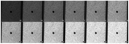 All of the reference images acquired during the 12 measurements mentioned in Section 2.2 can be seen in Figure 12. All these images were exported to MATLAB R2020a (MathWorks, Natick, MA, USA), where they were processed to evaluate their mean grey values (MGV). The obtained information about MGV characterising the image brightness is written in the lower right part of the captured images shown in Figure 12. A similar procedure to the calibration influence analysis was established, i.e., the mean relative differences in the evaluated equivalent von Mises stresses were determined to assess the influence of the changing image brightness.