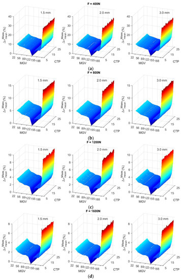 Influence of the image brightness and estimated calibration parameters on the evaluated equivalent von Mises stress: (a) F = 400 N, (b) F = 800 N, (c) F = 1200 N, (d) F = 1600 N. Note: MGV (mean gray value), CTP (calibration target positions).