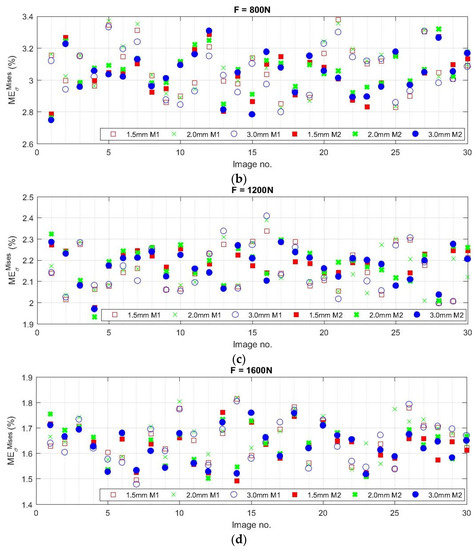 The deviations due to the use of different calibration sets (varying CTP) reach approximately the same levels as for the measurement described above (up to a maximum of 3% within all measurements). However, the levels of observed for the 12 measurements performed at varying image brightness were significantly larger than those obtained when comparing results from a single measurement. The following analysis was performed to reveal the reason causing the higher differences in equivalent von Mises stresses. For each of the four loading levels, i.e., for F = 400 N up to F = 1600 N, two measurements were performed, during which 30 images of the loaded specimen were captured under the same measurement conditions (MGV = 122). From the evaluated data, the mean relative measurement error was then determined according to the relation: