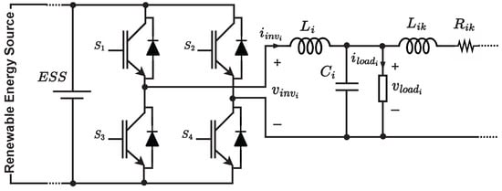 The electrical model of each of the inverters in this paper is illustrated in Figure 2, in which the output is connected to an LC filter and the input is connected to an energy storage system. The purpose of having LC filters is to eliminate the total harmonic distortion of the inverter output current. These passive filters are employed to curtail the amplitude of the harmonics and thereby improve the power quality [31]. In spite of the benefits of passive filters, they bring about undesired resonances, rendering the control design process more challenging [32]. Decentralized controllers aim to minimize the error between the load voltage and a sinusoidal reference voltage such that the entire network is robust against the coupling strength among the inverters, parameter uncertainties of the LC filter, and the undesired disturbances coming from the load variations.