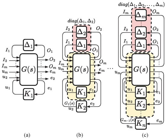 - Step 2. While controllers ,…, , and uncertainty matrices ,…, are left open (Figure 4b), controller is designed for system and uncertainty matrices and using the D–K iteration algorithm. Then, controller is placed in the loop with system to form the closed-loop system .⋮