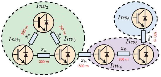 In this section, a network of IBDGs including six inverters is considered, as illustrated in Figure 5. The six inverters are connected to each other through interconnection lines indicated by impedances . Based on Section 2.3.3, this network is clustered into three subnetworks, which are identified by three dashed circles. As indicated in Figure 5, the distances between two neighboring inverters from the same and different subnetworks are and , respectively. The parameter mentioned in Subsection IV-C is chosen to be 0.01. The sequential control design procedure is separatelyapplied to each of the three subnetworks. MATLAB R2021a software was used in this paper to design the robust controllers using the robust control toolbox, and the Simulink/Simscape environment with a sampling time of was used to simulate the network of IBDGs shown in Figure 5. The parameter values of each of the generation systems are listed in Table 2. The LC filter parameters are chosen such that the total harmonic distortion of the inverter output voltage becomes minimized [7]. Furthermore, represents the inverter gain in Figure 3.