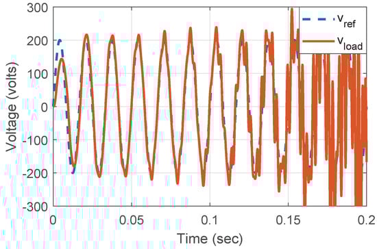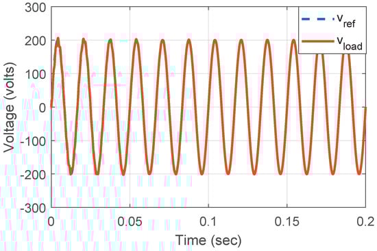 As mentioned in Section 3.1, the LC filter has uncertain parameters which are considered in the process of the robust control design. The variations of these parameters are in the range of . Figure 10 demonstrates the time response of the sequentially-designed control system. It can be clearly seen that the voltage closely tracks the reference voltage in spite of the parameter variations in the closed-loop system.