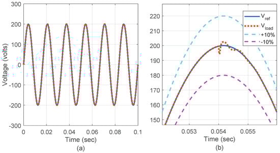 The load voltage of inverter () of the network of IBDGs depicted in Figure 5 when a and load is applied at : (a) full scale and (b) zoomed scale.