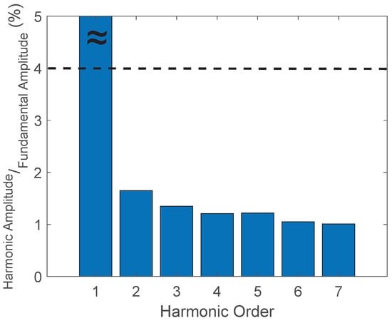 Harmonic contents of the load voltage of inverter () in Figure 5 for the case of the distorted nonlinear load current.