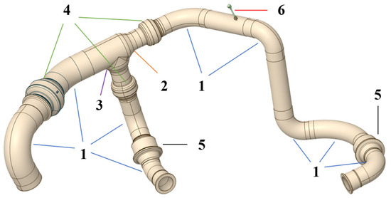 Figure 1. Structure diagram of engine air duct system: 1. bends; 2. reducing duct; 3. tee tube; 4. ball joints; 5. valves; 6. tie rod.