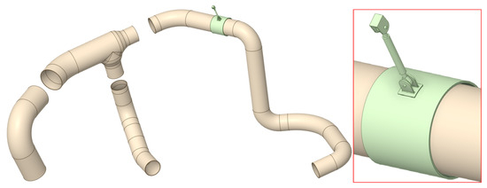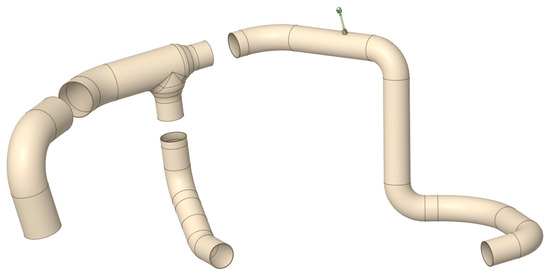 Due to the complex structure and large number of components in the air duct system of the engine studied in this paper, it was difficult to establish solid models for all components when building the model of the duct system. Therefore, in stress analysis of the duct system, the effects of certain components on the system can be reflected by simulating their functions. The simplified finite element model of the duct system is shown in Figure 2.