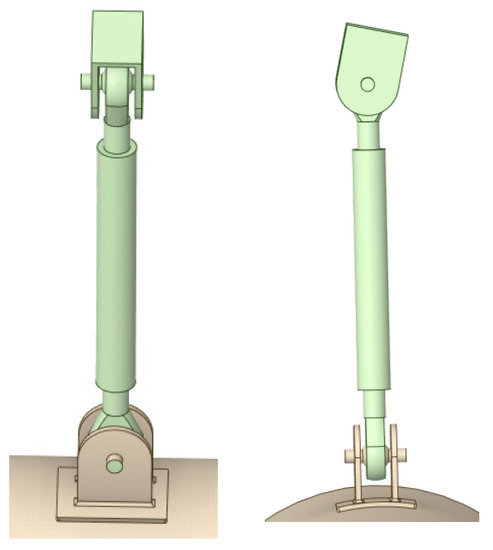 According to Table 1, the deflection angle of the tie rod is restricted by the distance D between the tie rod lugs. The larger the distance between the lugs, the greater the angle that the joint bearing can deflect. The tie rod used in this paper has rotational freedom of 0–5° in the XOY and YOZ planes and unrestricted rotation in the XOZ plane. During actual installation, the tie rod lugs at both ends must be arranged vertically, as shown in Figure 5.
