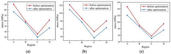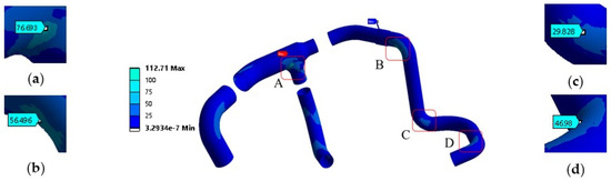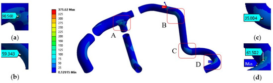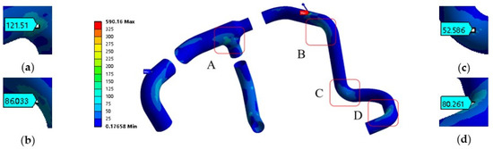 Figure 11. Duct stress distribution at 426.67 °C: (a) region A; (b) region B; (c) region C; (d) region D.