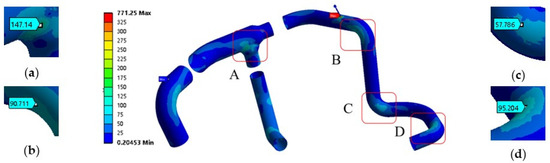 At a constant temperature of 537.78 °C, the stress distribution contours of the duct system under various characteristic pressures are shown in Figure 14, Figure 15 and Figure 16.