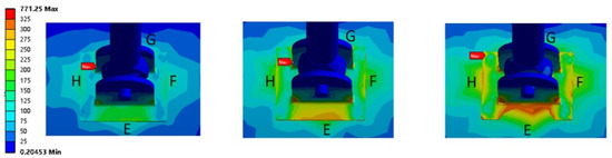 According to Figure 13, the stress at points E and G on the tie rod lug base was significantly higher than that at points F and H, and the main reason for this phenomenon is the rotational movement trend of the tie rod lug base around the FH axis, which caused a squeezed state at point E and a stretched state at point H. The maximum stress of the base increased from 375.62 MPa to 771.25 MPa, with an increase of 395.63 MPa, which exceeded the yield limit of 565.1 MPa at this temperature. Specifically, at a temperature of 537.78 °C, the stress in the duct system not only exceeded the limit but also caused separation and failure of the structure.