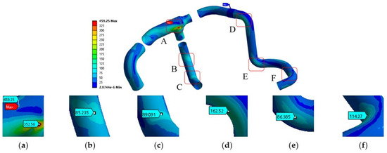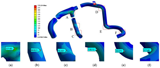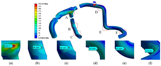 Figure 15. Duct stress distribution at a pressure of 1.5 MPa: (a) region A; (b) region B; (c) region C; (d) region D; (e) region E; (f) region F.