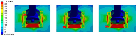 According to Figure 17, the overall stress of the base increased significantly after pressurization. The stress not only concentrated at the weld points on both sides of the tie rod lug but also spread to the entire base, causing a large increase in stress on both sides of the base in the direction of the duct path. The area where stress exceeded 325 MPa reached half of the base. As the pressure increased from 1 MPa to 2 MPa, the maximum stress fluctuated between 754 MPa and 776.34 MPa. This is because the pressure did not directly act on the base, but it still exceeded the yield limit of 565.1 MPa. It is worth noting that the separation failure phenomenon of the base was alleviated because the duct expanded after pressurization, further fitting the contact surface of the base.