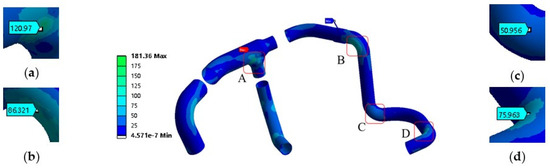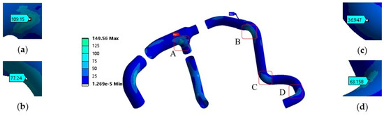 Since the above-established model involves elastic–plastic deformation and contact problems, Static Structural and its built-in Newton–Raphson method [31,32,33,34,35,36,37] were used to calculate the von Mises stress of the duct system [38,39,40,41,42,43], and stress calculation results were obtained under the characteristic operating conditions of the duct system [44].