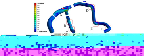 Figure 23. Duct stress distribution at a pressure of 1.5 MPa: (a) region A; (b) region B; (c) region C; (d) region D; (e) region E; (f) region F.