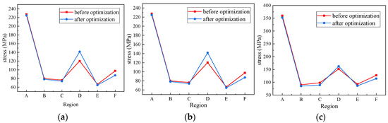 Figure 16. Duct stress distribution at a pressure of 2 MPa: (a) region A; (b) region B; (c) region C; (d) region D; (e) region E; (f) region F.