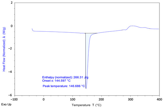 The peak on the graph corresponds to the highest rate of material melting. As illustrated in Figure 4, the melting temperature of achira fiber is measured at 146.68 °C. Additionally, being an endothermic process, the heat flow necessary for the fiber’s melting was calculated to be 266.31 J/g. One possible reason for the lack of Tg (glass transition temperature) visibility is that the thermal transition may exhibit small amplitudes in certain natural fibers, rendering it undetectable in the DSC.