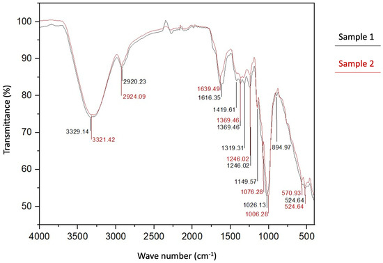 Figure 5 shows the results of FTIR obtained for two samples of the achira fiber, showing absorption peaks at 3329.14 cm−1 and 3321.42 cm−1, indicating axial deformations of the hydroxyl (OH) bond due to the presence of cellulose. The peaks at 2920.23 cm−1 and 2924.09 cm−1 are observed due to the stretching of the SP3 C-H bonds from cellulose vibration [47]. The peak value at 1616 cm−1 indicates the stretching of aromatic C=C with a strong conjugated C-C bond, attributed to the lignin content in the fiber [49]. The peak in the band at 1319 cm−1 is attributed to a strong acyl C-O with a superimposed C-H stretching of the phenols and esters. The bands in the natural fibers may vary around ±16 cm−1 from their position [47].