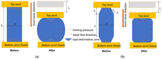 CEBU is a novel upsetting method that was developed from the deformation characteristics of traditional upsetting (TU). To highlight the difference between CEBU and TU in upsetting, Figure 1 schematically illustrates the two upsetting methods. The TU is schematically illustrated in Figure 1a. During the upsetting process, due to the friction between the anvil and billet, two large, rigid deformation zones are formed at the billet ends. Meanwhile, outside the rigid deformation zones, the metal flows nonuniformly from the billet inside to its surface. Therefore, due to the non-uniformity of metal flow, buckling will occur and longitudinal cracks may be formed simultaneously on the billet surface.