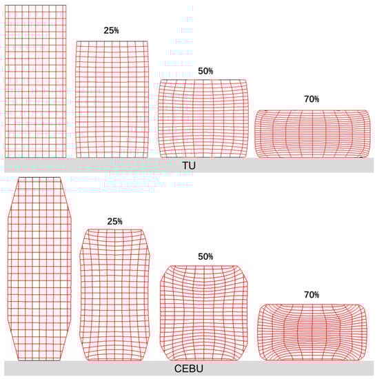 It is generally accepted that the deformation characteristics of the workpiece can be reflected by grid variation in finite element analysis. Accordingly, the simulation results of mesh variation on the billet symmetry plane under TU and CEBU are shown in Figure 3. Due to the friction effect at the billet end, the grids flow downwardly and radially in TU, which leads to bulging generated at the billet center. Meanwhile, the size of the bulge increases as the upsetting progresses. In CEBU, however, the deformation is initially concentrated at the cone end, and the frictional effect at the billet center is largely dispersed. Correspondingly, the bulging is first formed at the bottom of the cone end, and then disappears when the reduction ratio reaches 50%. Compared to TU, CEBU achieves a much smaller bulge.